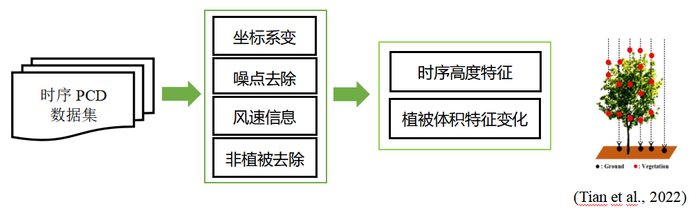 结构参数提取算法优化:最优栅格化冠层高度提取模型;基于体积表面差分,估算植被体积日变化,获取植被时序变化特征。